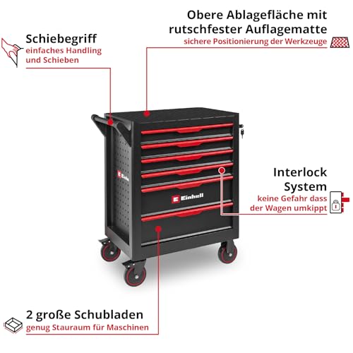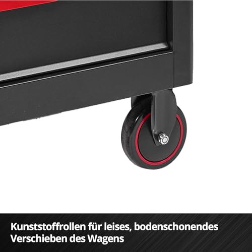 - Professionelle Optik – Einhell-Rot Akzente und der schwarze Korpus verleihen dem Werkstattwagen ein modernes, ansprechendes Design.